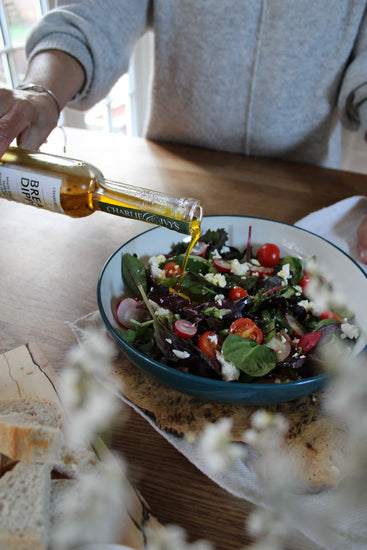 Cold rapeseed oil, red wine vinegar, rosemary, thyme and lemon oil. Simply pour into a bowl and dip generously with bread or use it to add flavour to baked fish, roast chicken and vegetables. Suitable for vegetarians, vegans and gluten free diets.