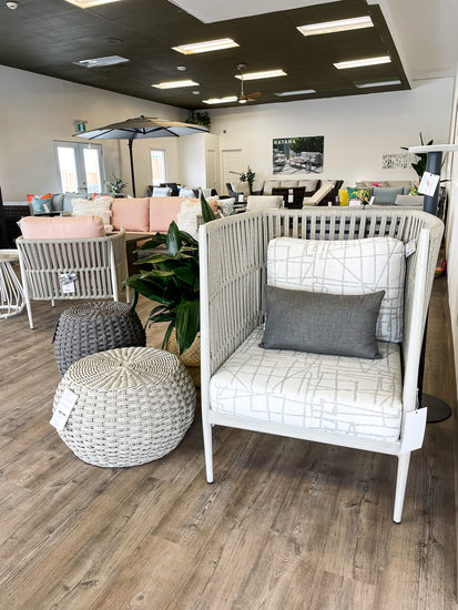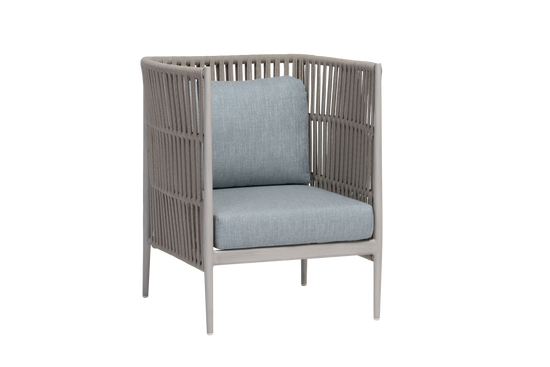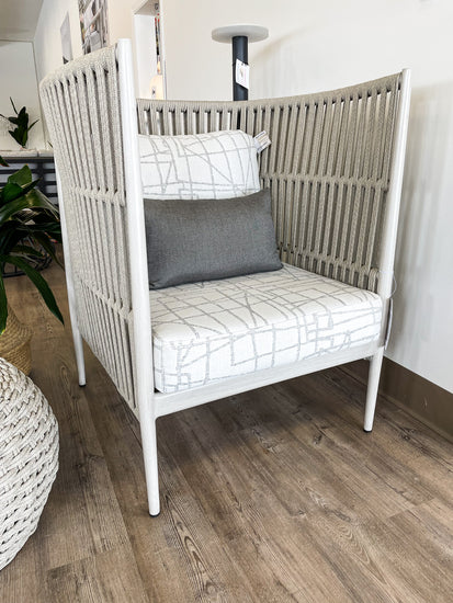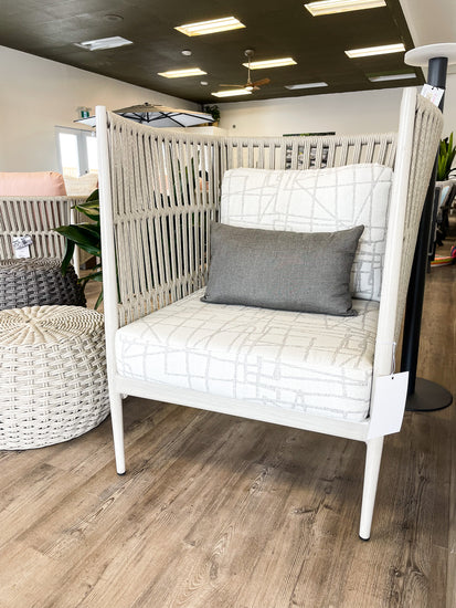 Lineas, Spanish for lines, marries Durarope™ weaving with a rounded barrel styled silhouette. The Lineas’ frame has a hand-brushed whitewashed finish and the chair’s tapered round legs offer a sleek design reminiscent of lounging in the Hamptons with a good book and a strong cocktail. Designed to withstand the elements, the triple-weave Durarope™ in Linen color, is UV and weather resistant to keep your new favorite outdoor set flawless for years to come.