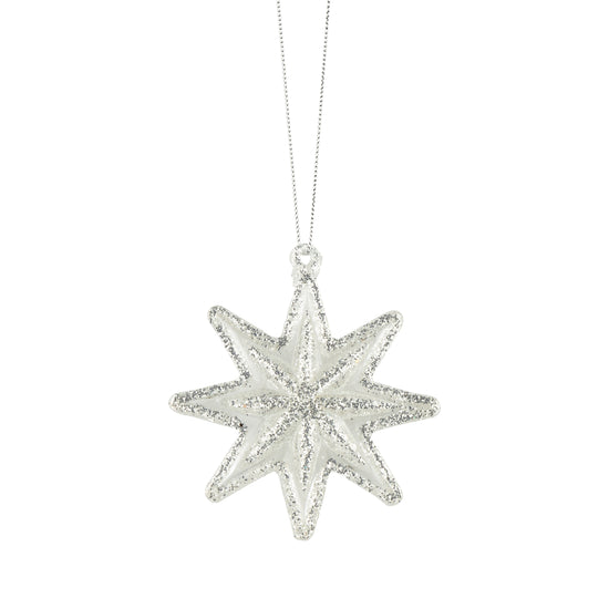 Molded glass 8-point star ornament with pale silver glitter, 3 inches