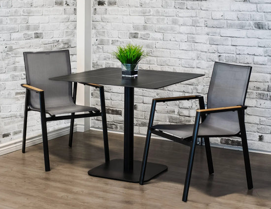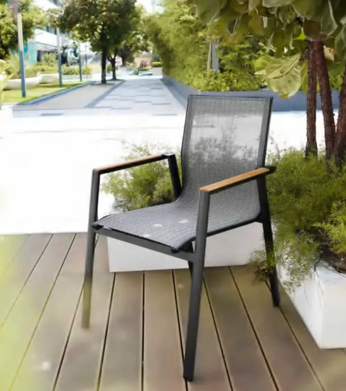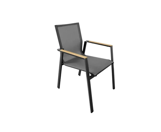 Atlas – This aluminum collection is complimented by textilene sling and carefully placed teak arm accents. Aluminum frames provide durability and strength, while textilene seats offer comfort and breathability. The teak accents add a touch of natural beauty, creating a visually appealing contrast with its sleek design.