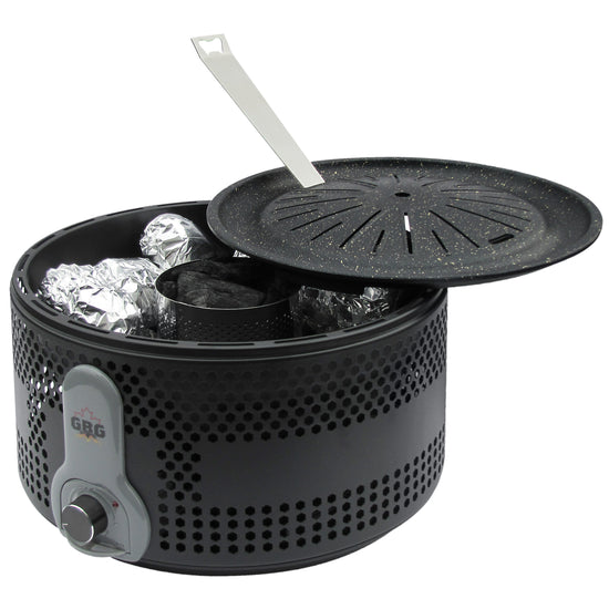 There is also a generous area below the grill surface to bake other items at the same time such as potatoes, corn, etc.! Using any small amount of lump charcoal, and a lighting block or gel, your Canadian Hot Stone grill will light and heat up very quickly with the self‑contained, small battery or USB‑powered fan in the base.