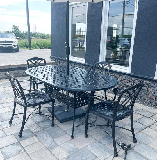 This dining set includes 1x Coordinate Table and 6x Terrace Café Arm Chairs.
