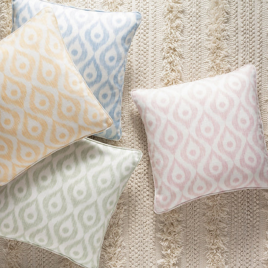 Beautiful genuine Ikat woven diamonds exhibit the blurry crenellations characteristic of the traditional dyeing technique that originated from Indonesia. Achieved by applying a resist to the yarns prior to dyeing to create spaces that build the pattern when the fabric is woven, line by line. An amazing combination of ancient technique meets modern performance, realized in sun, rain, dog and childproof yarns. These indoor/outdoor pillows will stand up to all the everyday elements.