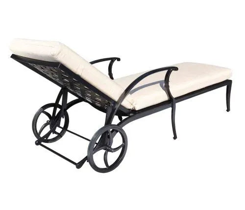 The Pure Cast Aluminum Chaise Lounge is classic in design, featuring a basketweave back & seat with arched arms. With wheels. Fabric shown: 8351 Linen Silver.