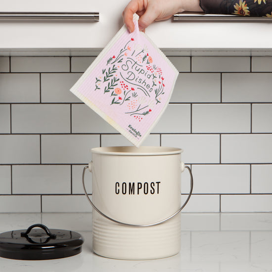 Be honest about after-meal tasks with this Ecologie Stupid Dishes Swedish dishcloth. The red and green flowers frame the funny saying to bring a bit of humor to this absorbent household helper.