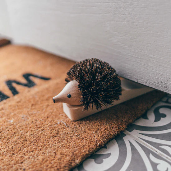 Door stopper made of domestic wood and natural fibers. Both convenient for propping your door open and for wiping the mud off your footwear. This little guy is 100% compostable!