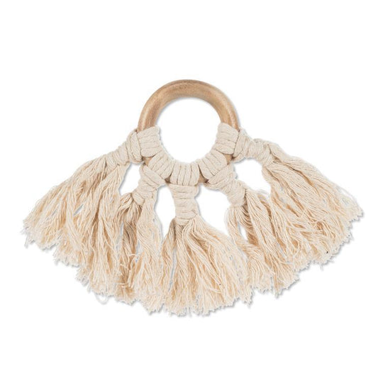 Add a rustic, hand-crafted element to your entertaining with this stylish Fringed Napkin Ring. Crafted out of wood and cotton, the elegantly simple weave of this napkin ring is accented with knotted fringes for a fabulous, folksy complement to your dining table. Available in navy, rust and ivory.