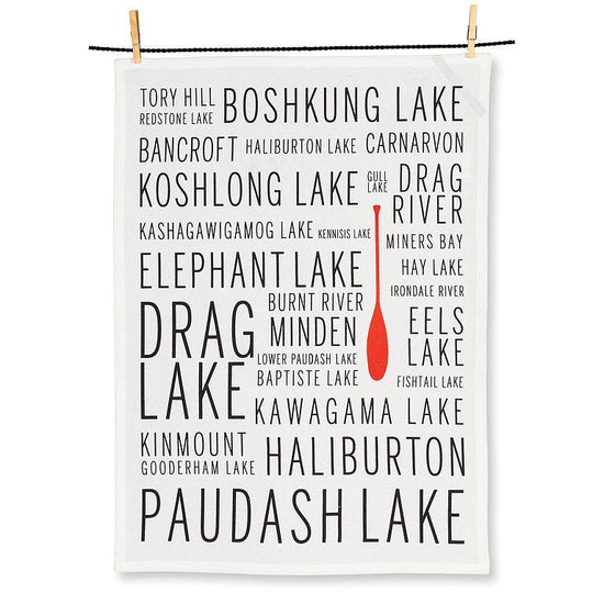 Keep your dishes dry, your kitchen tidy and Haliburton waterways top of mind with this unique Eastern Ontario Names Teal Towel. This cotton kitchen towel with design by ManMade – Canadian artist Doug Jackson's line of products inspired by vintage photographs, maps and ephemera – is an Abbott Exclusive, and features a word-map of Haliburton lakes and locales, complemented by a bright red paddle.
