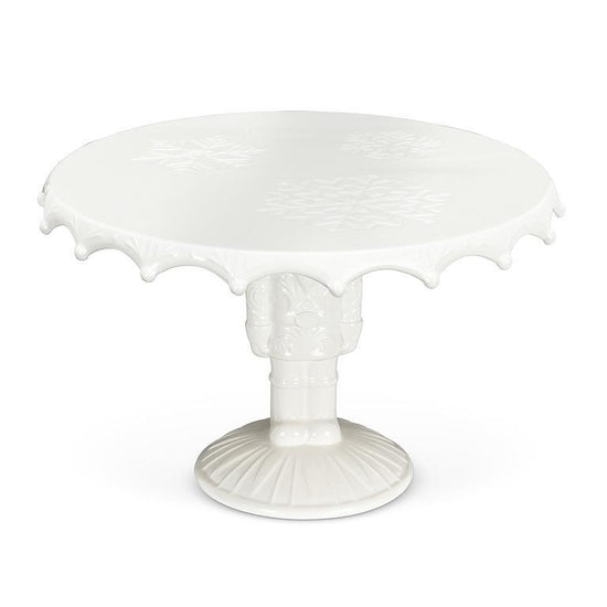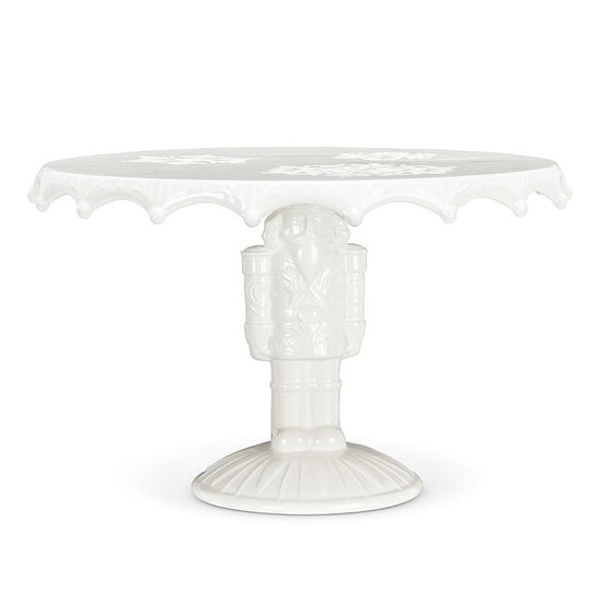 This Large Nutcracker Pedestal Cake Plate combines festive charm with elegant design, featuring a delicate snowflake pattern and a whimsical nutcracker motif. The 6 1/2" high raised pedestal adds a touch of sophistication, making it perfect for showcasing holiday desserts. A delightful centerpiece for any seasonal gathering or winter celebration.
