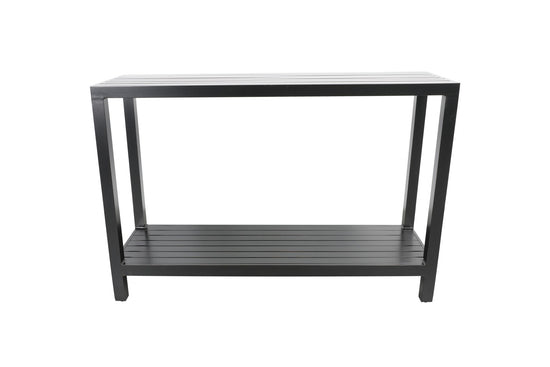 The Monaco Console Table includes 2 levels, with slats for drainage in each. This table coordinates well with many patio furniture styles for serving or decorative items, and it can also be used as a "back of sofa" table.