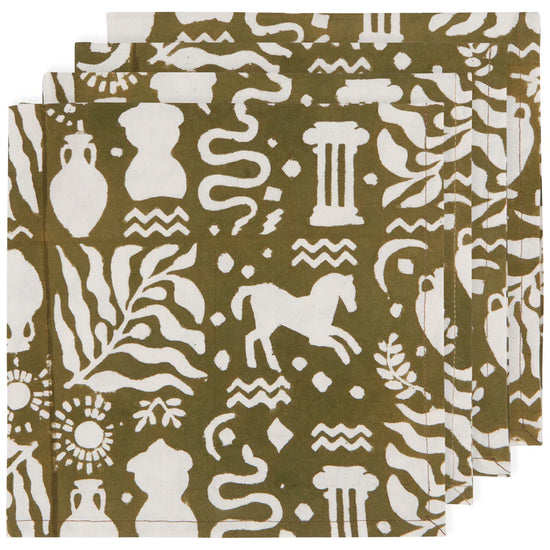 Elevate the table setting at your next dinner party with our divinely inspired set of Olympus Block Print Napkins. Utilizing a time-honored creative technique, imagery inspired by the ancients dances across a background of earthy green, resulting in distinctive dining accessories.