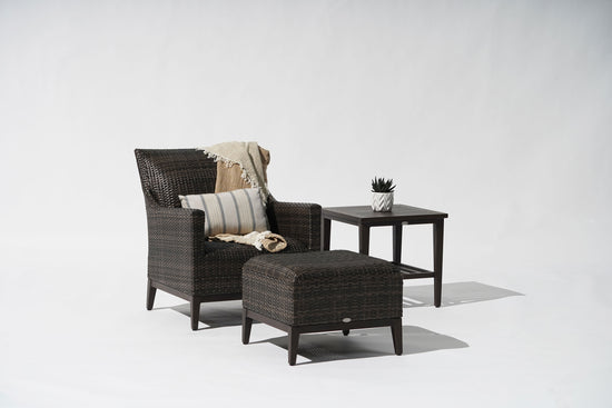 A collection of outdoor dining and living pieces, the Biltmore will bring you closer to nature while allowing you to kick back in total elegance. Available in our Wild Truffle resin woven finish on an aluminum frame, this set can weather the elements with its heat transfer legs and tables.