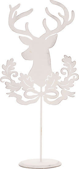 Rustic white painted metal stag with leaves & ribbon on stand 13.75 inches