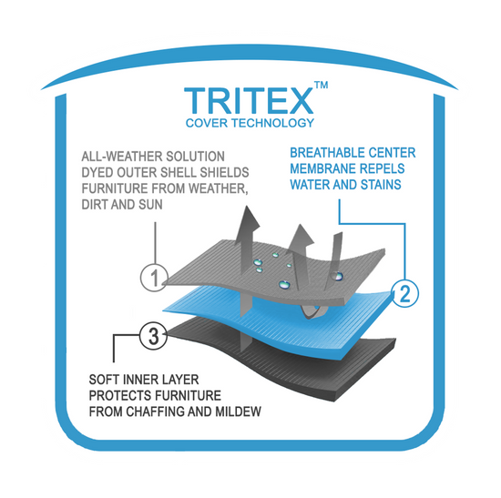 Slicker luxury quality, solution dyed marine grade fabric with exclusive TriTex provides three layers of protection for weather, water repellance and furniture scuff protection.
