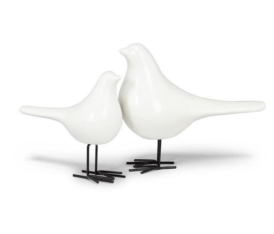 This small Modern Bird figurine in white with black wire legs is a stylish and playful piece that brings a touch of contemporary style to any space. With its sleek, minimalist design and curves, it makes an elegant complement to other decorative pieces, no matter where it's perched.
