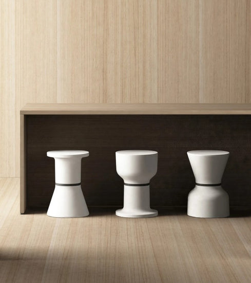 Essential yet non-simplified volumes, cross-references to well-known shapes, seen and recorded in our memories as archetypes of vases, columns, and capitals. These objects stand out almost undefined for their usage, therefore completely free to suggest different purposes reinterpreted from time to time. Put a book on it nearby a bed and it will become a nightstand; a cocktail by a pool will make it an outdoor table; inside the house or in a bathroom it could turn into a stool, while in a restaurant or café it could serve as a bag holder.