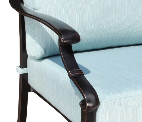 The “fair Verona” collection is traditional & ornamental in a style that is suggestive of antique cast iron furniture, & features a basketweave seat & an intertwined medallion motif on the chair back.