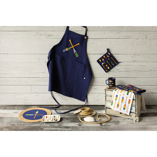A soft cotton apron is paired with extra long waist ties and a wooden button closure for function and charm.